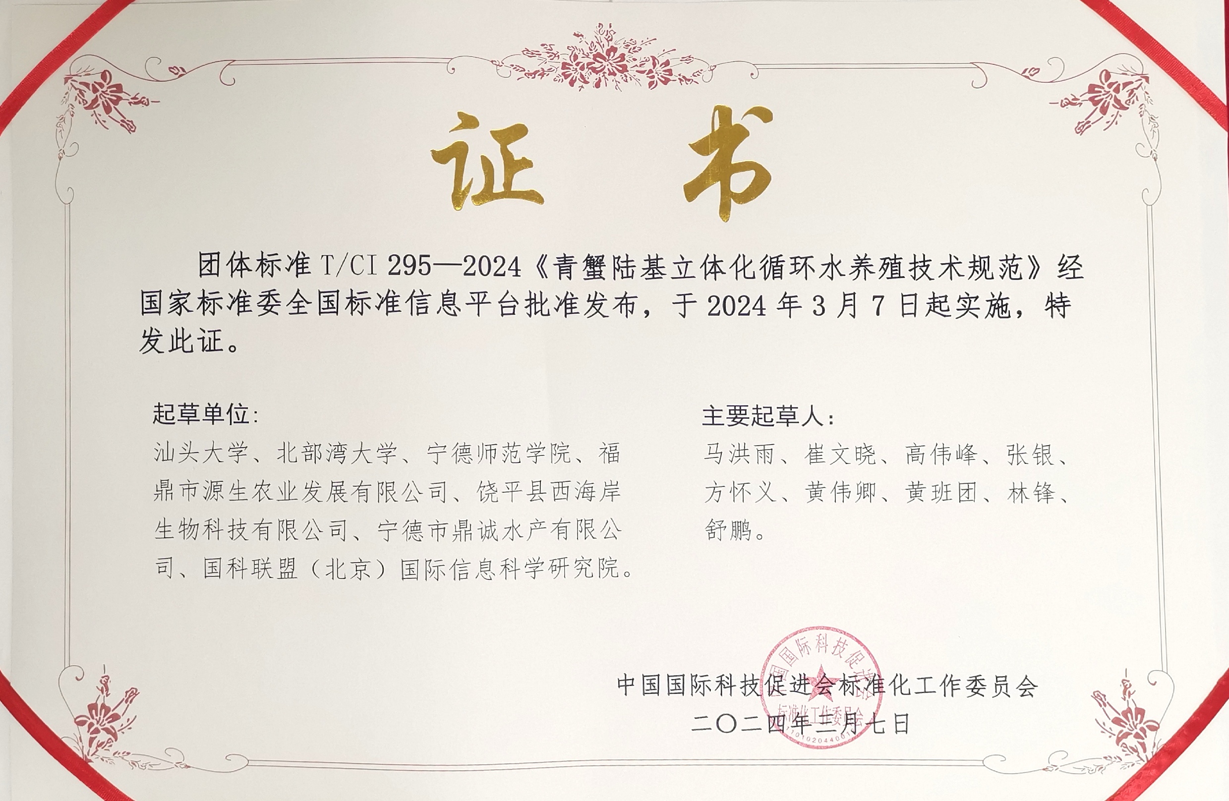 近日,由汕頭大學牽頭,北部灣大學、寧德師范學院、福鼎市源生農業發展有限公司、饒平縣西海岸生物科技有限公司、寧德市鼎誠水產有限公司等單位參與制定的《青蟹陸基立體化循環水養殖技術規范》團體標準(T/CT 295-2024),經中國國際科技促進會標準化工作委員會審批通過,正式發布實施,標志著我國青蟹陸基立體化循環水養殖向前邁出了重要一步。