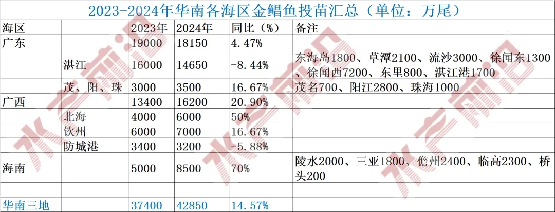 從清明前后開始,到目前已是6月初,在經歷了2個月左右時間的投苗后,2024年金鯧魚春苗的投放工作基本結束了。行業人士一直想了解華南三省各養殖海區投苗量是多少,說實話,想得到準確投苗數據并不容易。筆者從行業協會、料企人士、苗企人士、加工流通人士、養殖人士等處多方收集意見,與大家分享。