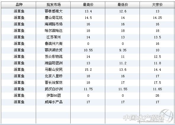 中國(guó)水產(chǎn)頻道獨(dú)家報(bào)道,7月2日全國(guó)主要批發(fā)市場(chǎng)活草魚價(jià)格行情如下:
