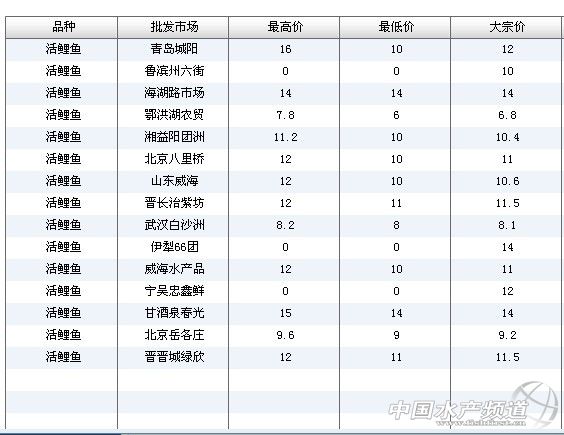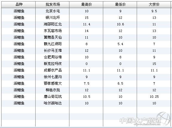 中國(guó)水產(chǎn)頻道獨(dú)家報(bào)道,7月2日全國(guó)主要批發(fā)市場(chǎng)活鯉魚價(jià)格行情如下: