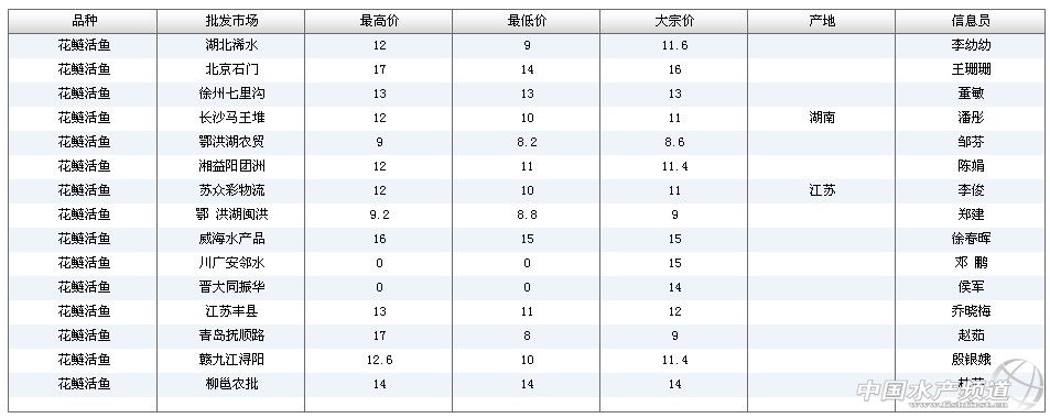 中國水產(chǎn)頻道報(bào)道,2013年11月25日湖南長沙花鰱價(jià)格行情如下: