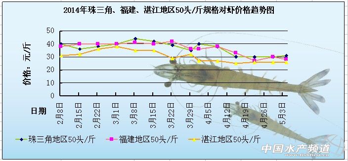 以下是2014年2月份到5月份,珠三角地區、湛江地區和福建地區50頭/斤規格對蝦的價格趨勢圖。