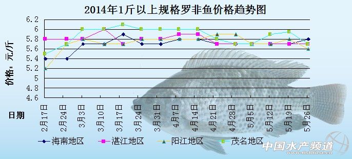 中國水產頻道原創報道,以下是海南地區、湛江地區、陽江地區、茂名地區2014年1斤以上規格羅非魚的價格趨勢圖。圖中可以看出,4月下旬至今,羅非魚的整體價格起伏波動較大,價格很不穩定。具體價格趨勢如下: