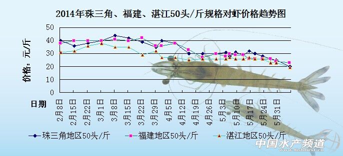 中國水產頻道原創報道,下圖是2014年珠三角地區、湛江地區和福建地區50頭/斤規格對蝦的價格趨勢圖。由圖中可以明顯分為2個不同的部分:2月份到4月中旬,對蝦價格處于比較高企的狀態;4月下旬至今,對蝦價格則處于不斷下滑的狀態,整體行情很低迷。具體價格趨勢如下: