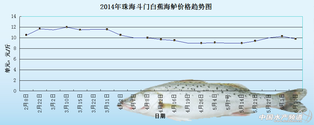 下圖是珠海斗門白蕉海鱸價格自2014年2月8日起到今天(6月10日)的每周趨勢圖: