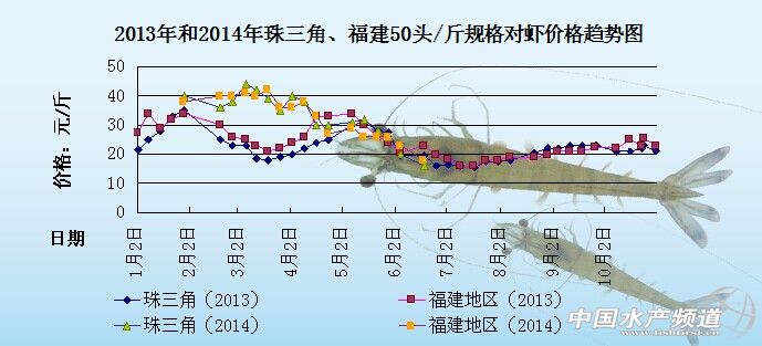 中國水產(chǎn)頻道原創(chuàng)報(bào)道,下圖是2013年和2014年珠三角地區(qū)、福建地區(qū)50頭/斤規(guī)格對(duì)蝦的價(jià)格趨勢(shì)圖。由圖中可以看出2-3月份這個(gè)時(shí)間段2014年對(duì)蝦的價(jià)格比2013年的對(duì)蝦價(jià)格要高10-20元/斤,但是從4月中下旬開始2014年和2013年的對(duì)蝦價(jià)格就幾乎持平了;現(xiàn)在6月20日的對(duì)蝦價(jià)格相比去年同期還要低2-3元/斤。具體價(jià)格趨勢(shì)如下: