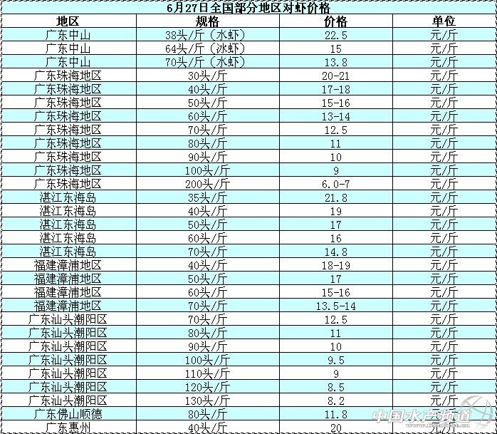 據悉,本周各地的對蝦出塘量都很少,都是以小規格對蝦為主,因為地區差異,各地的市場銷售量也有所不同,所以本周各地的對蝦價格相比上周有漲也有跌,但是后市價格業內人士皆不看好。具體價格如下: