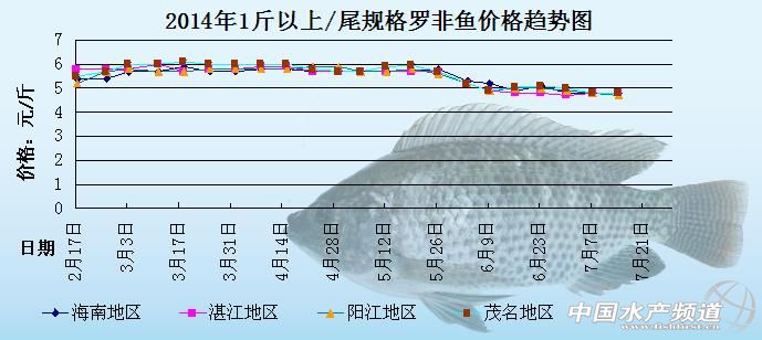 中國(guó)水產(chǎn)頻道原創(chuàng)報(bào)道,以下是海南地區(qū)、湛江地區(qū)、陽(yáng)江地區(qū)、茂名地區(qū)2014年1斤以上/尾規(guī)格羅非魚的價(jià)格趨勢(shì)圖。圖中可以很明顯的看出,2月中旬直到5月底,羅非魚的整體價(jià)格都是處于比較高企的狀態(tài),但是6月份開始,羅非魚的整體價(jià)格就處于一個(gè)相對(duì)低迷的狀態(tài),整體價(jià)格下滑的比較厲害。6月下旬至今,羅非魚價(jià)格整體趨于平穩(wěn),價(jià)格波動(dòng)不大。具體價(jià)格趨勢(shì)如下:
