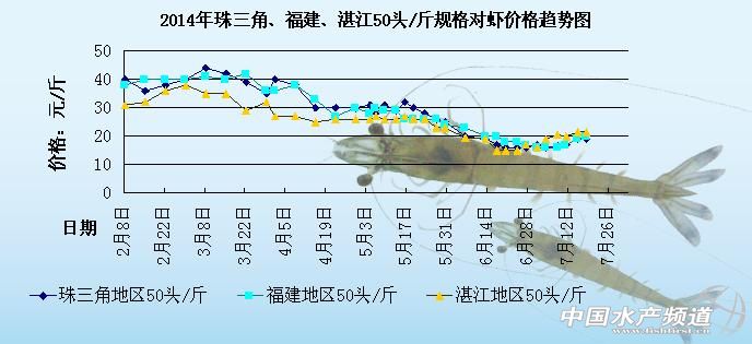 中國水產頻道原創報道,下圖是2014年珠三角地區、湛江地區和福建地區50頭/斤規格對蝦的價格趨勢圖。整個圖很明顯的就可以區分為2個不同的部分:2月份到4月份整體的蝦價處于非常高企的狀態;5月份至7月初整體蝦價就一直不斷下滑,整體價格比較低迷,7月中旬蝦價開始出現上漲。具體價格趨勢如下: