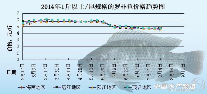 中國水產頻道原創報道,以下是海南地區、湛江地區、陽江地區、茂名地區2014年1斤以上/尾規格羅非魚的價格趨勢圖。圖中可以很明顯的看出,2月中旬直到5月底,羅非魚的整體價格都是處于比較高企的狀態,但是6月份開始,羅非魚的整體價格就處于一個相對低迷的狀態,整體價格下滑的比較厲害。到了7月下旬,各地的羅非魚價格因為出魚量和病害的問題出現了不同程度的波動。具體價格趨勢如下: