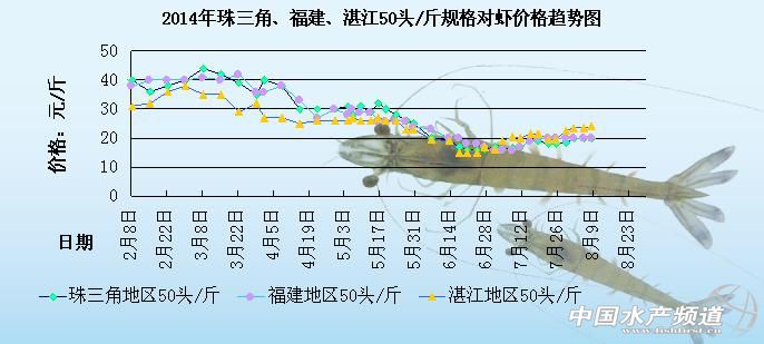 中國水產頻道原創報道,下圖是2014年珠三角地區、湛江地區和福建地區50頭/斤規格對蝦的價格趨勢圖。整個圖很明顯的就可以區分為2個不同的部分:2月份到4月份整體的蝦價處于非常高企的狀態;5月份至6月下旬整體蝦價就一直不斷下滑,整體價格比較低迷,7月初蝦價開始出現上漲。具體價格趨勢如下: