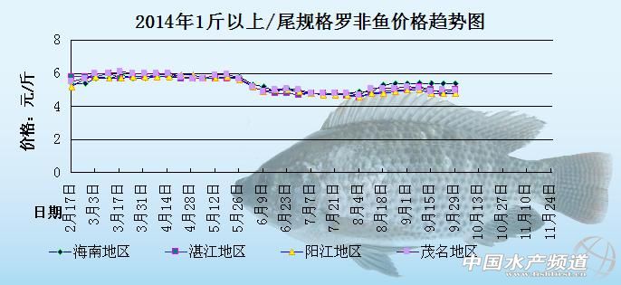 中國水產頻道原創報道,以下是海南地區、湛江地區、陽江地區、茂名地區2014年1斤以上/尾規格羅非魚的價格趨勢圖。圖中可以很明顯的看出,2月中旬直到5月底,羅非魚的整體價格都是處于比較高企的狀態,但是6月份到7月份,羅非魚的整體價格就處于一個相對低迷的狀態,整體價格下滑的比較厲害。8月初,各地的羅非魚價格開始慢慢上漲,行情一直到9月初都是很平穩的,9月中旬開始整體價格又再次下降。具體價格趨勢如下: