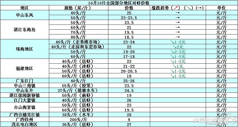 據(jù)悉,本周各地回饋的信息都說對蝦市場的銷售量不好,整體行情偏向低迷,加上換季氣候變化的問題,導(dǎo)致很多對蝦因應(yīng)激過大而發(fā)病,病蝦增多一定程度上也影響了對蝦的價格,估計短期內(nèi)各地的蝦價還是會維持現(xiàn)狀,蝦價上漲的空間不大。具體價格如下: