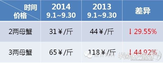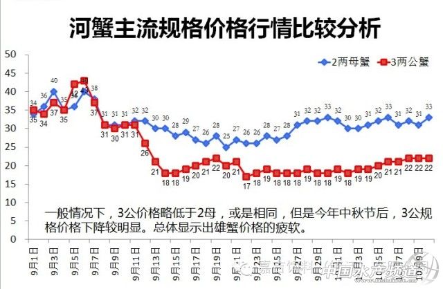 9月份以中秋節(jié)為節(jié)點,母蟹總體呈現(xiàn)兩頭高、中間低的走勢。節(jié)后公蟹價格下降較快,尤其是3兩以上的規(guī)格蟹,其中4.5兩公蟹已經(jīng)逼近2兩母蟹價格。9月底,2兩母蟹已和去年同期價格相仿,是為有利變化。