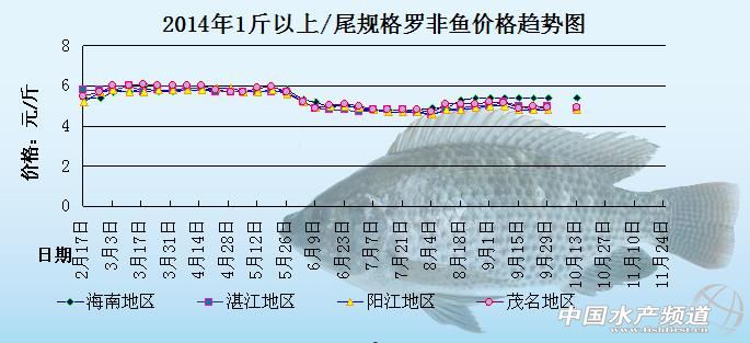 中國水產頻道原創報道,以下是海南地區、湛江地區、陽江地區、茂名地區2014年1斤以上/尾規格羅非魚的價格趨勢圖。圖中可以很明顯的看出,2月中旬直到5月底,羅非魚的整體價格都是處于比較高企的狀態,但是6月份到7月份,羅非魚的整體價格就處于一個相對低迷的狀態,整體價格下滑的比較厲害。8月初,各地的羅非魚價格開始慢慢上漲,行情一直到9月初都是很平穩的,9月中旬開始整體價格又再次下降。具體價格趨勢如下: