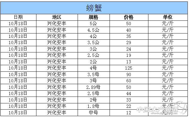 中國水產頻道獨家報道,據網友提供消息,2014年10月18日江蘇興化安豐河蟹價格行情如下: