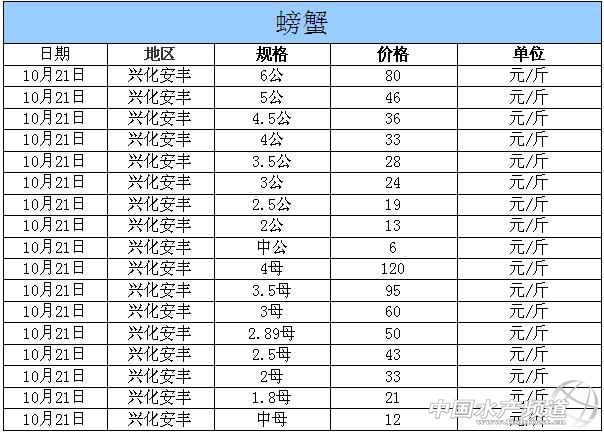 中國水產頻道獨家報道,據網友提供消息,2014年10月21日江蘇興化安豐河蟹價格行情如下:
