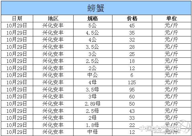 中國水產(chǎn)頻道獨家報道,據(jù)網(wǎng)友提供消息,2014年10月29日江蘇興化安豐河蟹價格行情如下: