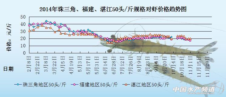 中國水產頻道原創報道,下圖是2014年珠三角地區、湛江地區和福建地區50頭/斤規格對蝦的價格趨勢圖。整個圖很明顯的就可以區分為2個不同的部分:2月份到4月份整體的蝦價處于非常高企的狀態;5月份至6月下旬整體蝦價就一直不斷下滑,整體價格比較低迷,7月初蝦價開始出現上漲,到了9月份,因為存塘量和銷售量等問題,整體蝦價一直不斷的浮動,但是升降幅度不算太大;10月國慶假期之后,市場剛性需求明顯減少,對蝦銷售進入淡季,各地的蝦價一直處于下行的狀態。具體價格趨勢如下: