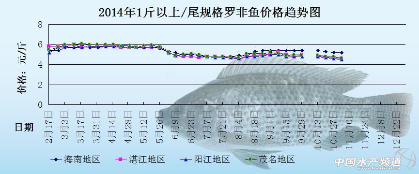 中國(guó)水產(chǎn)頻道原創(chuàng)報(bào)道,以下是海南地區(qū)、湛江地區(qū)、陽(yáng)江地區(qū)、茂名地區(qū)2014年1斤以上/尾規(guī)格羅非魚(yú)的價(jià)格趨勢(shì)圖。圖中可以很明顯的看出,2月中旬直到5月底,羅非魚(yú)的整體價(jià)格都是處于比較高企的狀態(tài),但是6月份到7月份,羅非魚(yú)的整體價(jià)格就處于一個(gè)相對(duì)低迷的狀態(tài),整體價(jià)格下滑的比較厲害。8月初,各地的羅非魚(yú)價(jià)格開(kāi)始慢慢上漲,行情一直到9月初都是很平穩(wěn)的,9月中旬至今整體價(jià)格都是處于不斷下滑的狀態(tài),整體行情趨于低迷。具體價(jià)格趨勢(shì)如下: