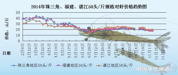 中國水產頻道原創報道,下圖是2014年珠三角地區、湛江地區和福建地區50頭/斤規格對蝦的價格趨勢圖。整個圖很明顯的就可以區分為2個不同的部分:2月份到4月份整體的蝦價處于非常高企的狀態;5月份至6月下旬整體蝦價就一直不斷下滑,整體價格比較低迷,7月初蝦價開始出現上漲,到了9月份,因為存塘量和銷售量等問題,整體蝦價一直不斷的浮動,但是升降幅度不算太大;10月國慶假期之后,市場剛性需求明顯減少,對蝦銷售進入淡季,各地的蝦價一直處于下行的狀態。具體價格趨勢如下: