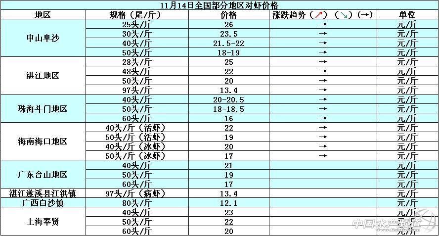 據悉,進入11月中旬各地的對蝦存塘量越來越少,近幾天的市場銷售量有所好轉,整體蝦價保持相對平穩,價格暫無波動。現在很多養殖戶都在準備投放冬棚苗,預計后市蝦價將會趨于上漲。具體價格如下: