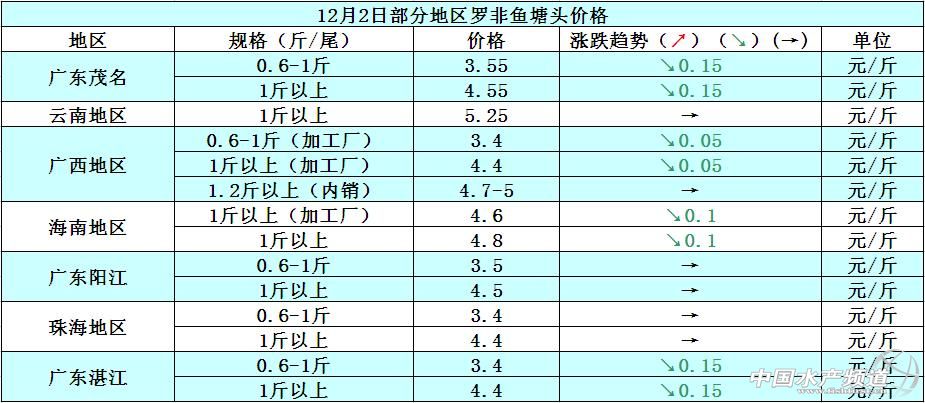據(jù)悉,最近幾天受寒潮的影響,各地羅非魚出塘量都很少,加工廠方面的訂單也很少,因?yàn)槟甑谆乜罾щy,很多魚中都不愿意收魚,整體銷量很不理想,各地魚價(jià)紛紛下滑,預(yù)計(jì)短期內(nèi)整體魚價(jià)將會(huì)持續(xù)低谷,魚價(jià)上漲空間不大。具體價(jià)格如下: