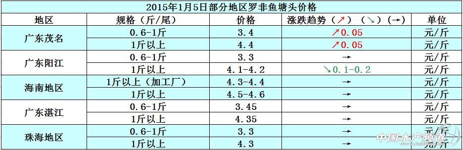 據(jù)悉,元旦過(guò)后,各地的羅非魚(yú)出塘量不大,整體銷(xiāo)量不理想,加工廠方面的實(shí)際收購(gòu)量偏小,整體魚(yú)價(jià)依舊處于低迷的狀態(tài),預(yù)計(jì)后市魚(yú)價(jià)難上漲;現(xiàn)在各地的養(yǎng)殖戶都持觀望的狀態(tài),賣(mài)魚(yú)意愿不強(qiáng),養(yǎng)殖戶多數(shù)選擇把羅非魚(yú)留塘過(guò)冬,準(zhǔn)備開(kāi)春之后再賣(mài)。具體價(jià)格如下:
