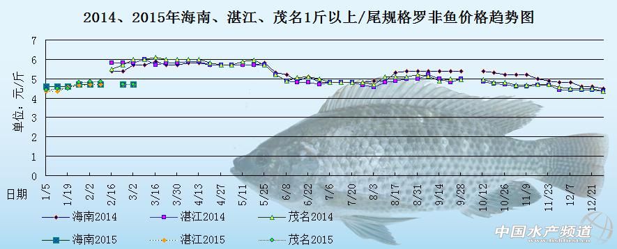 中國水產(chǎn)頻道原創(chuàng)報(bào)道,以下是海南地區(qū)、湛江地區(qū)、陽江地區(qū)、茂名地區(qū)2014年和2015年1斤以上/尾規(guī)格羅非魚的價(jià)格趨勢圖。圖中可以很明顯的看出,2015年的羅非魚價(jià)格跟2014年的羅非魚價(jià)格相比相差了1元左右/斤,整體價(jià)格差異很大。2015年1月初,元旦過后,各地的銷售行情依舊低迷,魚價(jià)毫無起色,預(yù)計(jì)后市魚價(jià)漲幅空間不大。1月中下旬,部分地區(qū)的魚價(jià)稍有上漲,但是行情依舊不理想,整體銷售量還是偏小。2月初,各地合規(guī)格的羅非魚存塘量少,年關(guān)越來越近,加工廠也陸續(xù)放假,預(yù)計(jì)短期內(nèi)的魚價(jià)還是趨向于平穩(wěn),上漲空間不會(huì)太大。2月中下旬,因?yàn)槭悄昙倨陂g,各地的加工廠還未開始上班,市場銷售量方面也處于相對穩(wěn)定的狀態(tài),魚價(jià)跟放假之前相比整體持平,價(jià)格無變化。具體價(jià)格趨勢如下: