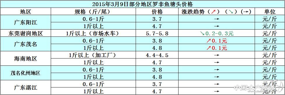 據(jù)悉,現(xiàn)在各地存塘的羅非魚量很多,但是最近的市場剛性需求不大,整體銷售量并不理想,加上羅非魚加工廠還未全部開工,羅非魚整體走量很小,預(yù)計短期內(nèi)魚價將低位運行,價格上漲難度大。具體價格如下: