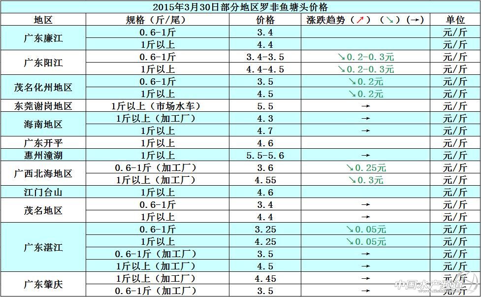 中國水產頻道原創報道,以下是海南地區、湛江地區、陽江地區、茂名地區2014年和2015年1斤以上/尾規格羅非魚的價格趨勢圖。圖中可以很明顯的看出,2015年的羅非魚價格跟2014年的羅非魚價格相比相差了1元左右/斤,整體價格差異很大。2015年1月初,元旦過后,各地的銷售行情依舊低迷,魚價毫無起色,預計后市魚價漲幅空間不大。1月中下旬,部分地區的魚價稍有上漲,但是行情依舊不理想,整體銷售量還是偏小。2月初,各地合規格的羅非魚存塘量少,年關越來越近,加工廠也陸續放假,預計短期內的魚價還是趨向于平穩,上漲空間不會太大。2月中下旬,因為是年假期間,各地的加工廠還未開始上班,市場銷售量方面也處于相對穩定的狀態,魚價跟放假之前相比整體持平,價格無變化。3月初,春節假期已過,市場需求減淡,魚價持續低位運行,整體價格難上漲。3月中旬,羅非魚加工廠的訂單量少,致使加工廠的收購量縮減,加上內銷市場的需求量少,現在整體魚價趨向下滑,預計短期內各地的魚價上漲難度較大。具體價格趨勢如下: