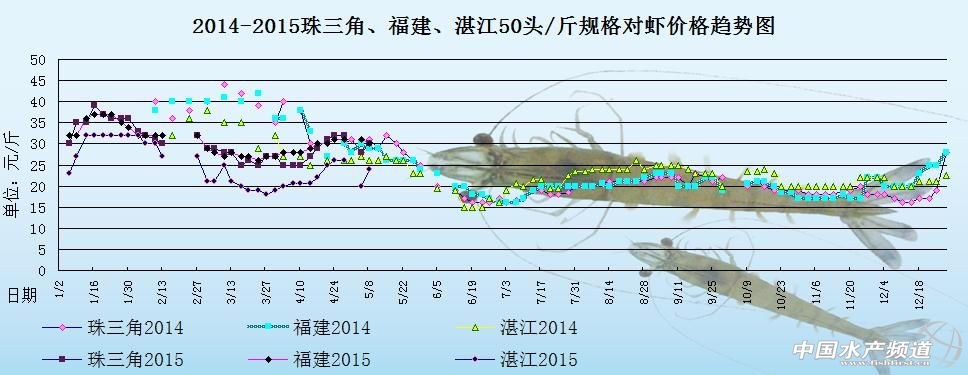 中國水產頻道原創報道,下圖是2014年和2015年珠三角地區、湛江地區和福建地區50頭/斤規格對蝦的價格趨勢圖。2015年年初,元旦剛過,各地存塘的蝦非常少,各地蝦價都在飆漲。由圖中可以明顯看出,至3月初為止,2015年的蝦價跟2014年同期的蝦價相比,價格相差10元左右/斤,價格差異幅度較大。3月下旬,各地合規格上市的對蝦量很少,存塘的多數都是剛剛投放不久的蝦苗,市場供貨量不足,各地蝦價都在緩步上漲中,后市蝦價被看好。4月初,臨近清明時節,各地的對蝦市場需求量有所變化,導致行情波動、蝦價升降不一。4月中旬,各地存塘合規格上市對蝦量大大減少,以致于市場供應量不足,各地蝦價都在慢慢增長中,整體行情趨于上漲。4月中下旬,因為臨近五一假期,很多養殖戶都在待價而沽,準備等到五一假期蝦價高漲才賣蝦,致使對蝦出塘量大大減少,短期內各地蝦價都趨向上漲。五一假期過后,對蝦市場消費進入疲軟狀態,致使蝦價下滑,各地現有存塘合規格上市的對蝦少,市場需求平淡,預計短期內蝦價上漲可能性低,后市行情不被看好。具體價格趨勢如下: