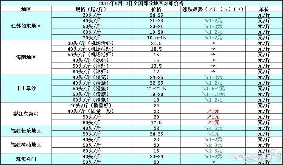 據悉,最近沒有節假日活動去推動對蝦市場的消費量,對蝦市場的剛性需求有所縮減,導致各地對蝦的銷量和蝦價齊齊下滑,市場對蝦的整體銷售有滯銷的現象出現。預計到了端午節的時候,對蝦的市場銷量會有所增長,但是蝦價變化可能不會太大。具體價格如下: