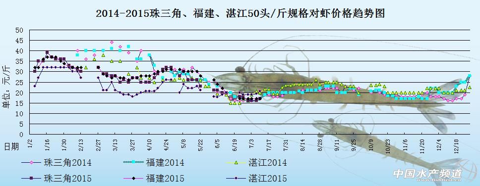中國水產(chǎn)頻道原創(chuàng)報道,下圖是2014年和2015年珠三角地區(qū)、湛江地區(qū)和福建地區(qū)50頭/斤規(guī)格對蝦的價格趨勢圖。2015年年初,元旦剛過,各地存塘的蝦非常少,各地蝦價都在飆漲。由圖中可以明顯看出,至3月初為止,2015年的蝦價跟2014年同期的蝦價相比,價格相差10元左右/斤,價格差異幅度較大。4月中旬,各地存塘合規(guī)格上市對蝦量大大減少,以致于市場供應(yīng)量不足,各地蝦價都在慢慢增長中,整體行情趨于上漲。4月中下旬,因為臨近五一假期,很多養(yǎng)殖戶都在待價而沽,準備等到五一假期蝦價高漲才賣蝦,致使對蝦出塘量大大減少,短期內(nèi)各地蝦價都趨向上漲。五一假期過后,對蝦市場消費進入疲軟狀態(tài),致使蝦價下滑,各地現(xiàn)有存塘合規(guī)格上市的對蝦少,市場需求平淡,預計短期內(nèi)蝦價上漲可能性低,后市行情不被看好。6月初,受到高溫天氣或頻繁降雨天氣的影響,各地對蝦養(yǎng)殖的發(fā)病率增加,部分地區(qū)的對蝦供應(yīng)出現(xiàn)短缺,但是市場銷量很不理想,近期各地蝦價都是處于不斷下滑的狀態(tài)。6月下旬,端午節(jié)假期一過,各地對蝦的市場消費量劇減,整體銷量馬上呈現(xiàn)回落狀態(tài),受此影響,蝦價也跟著不斷下跌,預計短期內(nèi)各地的蝦價上漲難度大,后市行情不被看好。7月初,各地一造蝦的存塘量都減少了很多,相應(yīng)的整體對蝦供應(yīng)量也減少了,雖然市場的銷量沒有增大,但是蝦價方面也有回暖的跡象,如果短期內(nèi)對蝦供應(yīng)量保持穩(wěn)定的話,后市蝦價上漲空間會更大。具體價格趨勢如下: