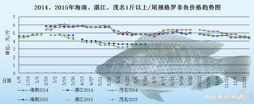中國水產頻道原創報道,以下是海南地區、湛江地區、茂名地區2014年和2015年1斤以上/尾規格羅非魚的價格趨勢圖。圖中可以很明顯的看出,2015年的羅非魚價格跟2014年的羅非魚價格相比相差了1元左右/斤,整體價格差異很大。