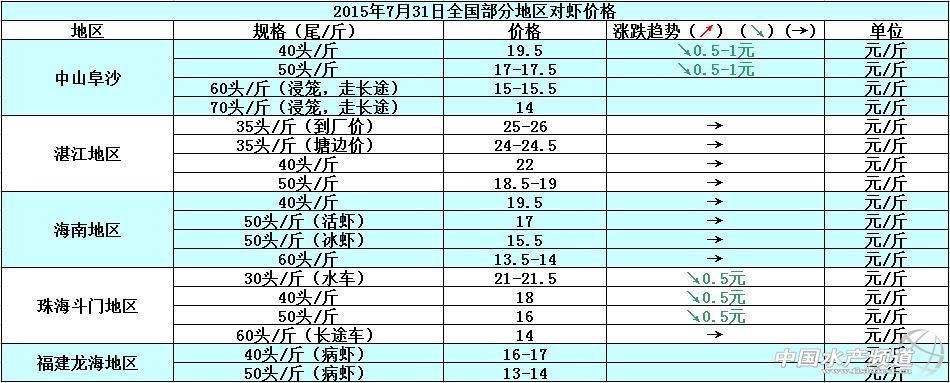7月中下旬,各地降雨天氣頻繁,加之無節假日活動去推動對蝦的市場消費量,整體市場銷量疲軟,對蝦存塘供應量雖然減少,但是蝦價上漲依舊受到阻礙,預計后市蝦價或將持續現狀,價格上漲空間小。具體價格趨勢如下: