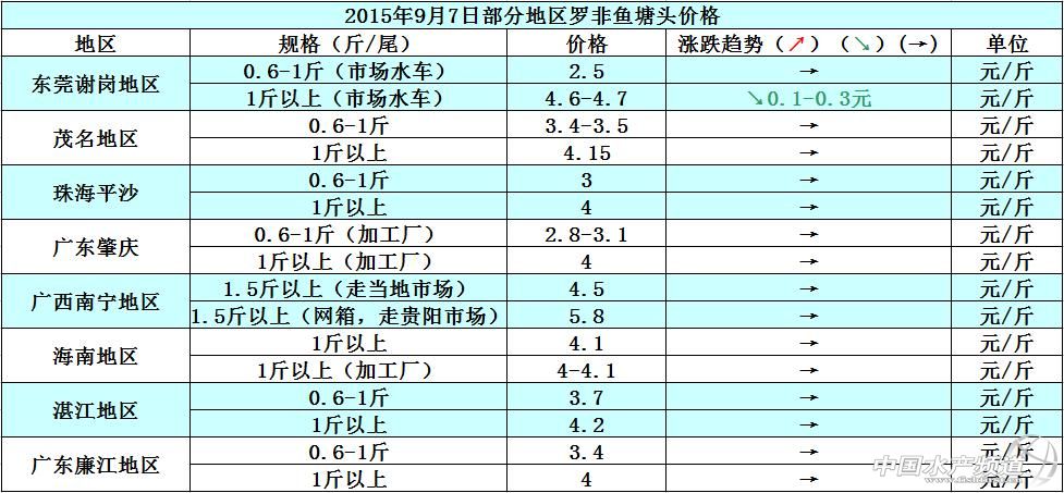 9月初,各地合規格上市的羅非魚存塘量依舊很少,而且魚價跟8月下旬相比幾乎持平,魚價方面并沒有明顯增加,一部分原因是各地學生返校,相應的羅非魚市場剛需也有所減少,還有一部分原因是羅非魚外銷的藥物殘留監測不合格的問題,據說有部分加工廠因為羅非魚原料藥殘監測不合格被列入了黑名單。具體價格趨勢如下: