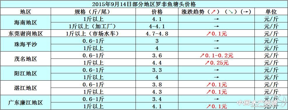 9月中旬,因為之前高溫天氣和病害問題等影響,多數養殖戶都不怎么投喂飼料,導致羅非魚的生長速度減緩,各地現有存塘的羅非魚多數都未達到上市規格具體價格,整體供貨量不足。近期整體的外銷及內銷走量都不多,所以短期內魚價都是處于穩中稍漲的狀態,價格上漲幅度不大。具體價格趨勢如下: