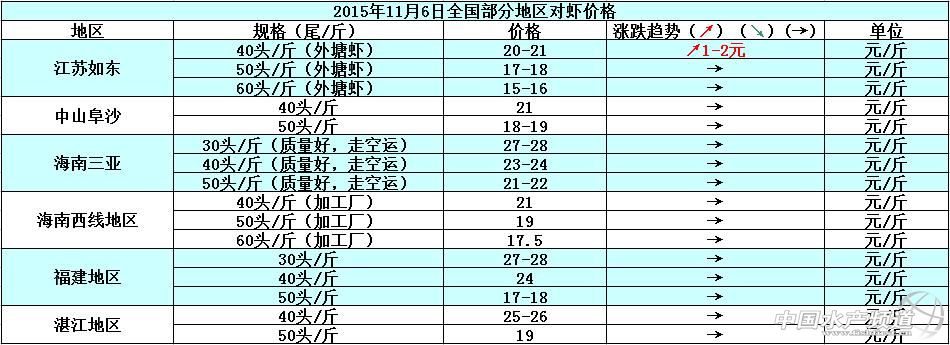 11月初,正是對(duì)蝦養(yǎng)殖交接期,可供應(yīng)上市的對(duì)蝦存塘量在不斷減少,對(duì)蝦供應(yīng)開(kāi)始出現(xiàn)緊張,加之部分養(yǎng)殖戶(hù)選擇待價(jià)而沽,所以蝦價(jià)方面也在持續(xù)上漲,整體行情被看好。具體價(jià)格趨勢(shì)如下: