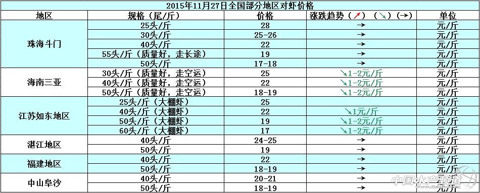 11月下旬,因為冷空氣的原因,各地對蝦上市量過多,市場呈現供大于求的局面,整體市場銷量很差,而且個別地區還有滯銷現象出現,各地蝦價趨向穩中下行,預計短期內蝦行情波動會比較頻繁。具體價格趨勢如下: