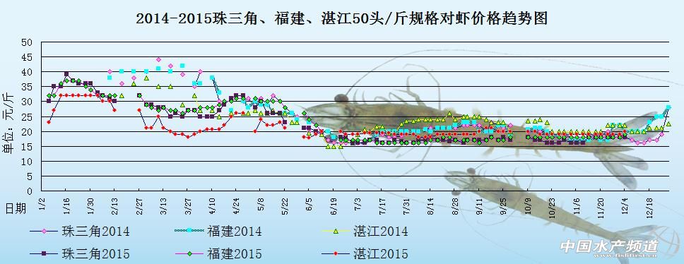 中國水產頻道原創報道,下圖是2014年和2015年珠三角地區、湛江地區和福建地區50頭/斤規格對蝦的價格趨勢圖。由圖中可以明顯看出,年后至4月初,2015年的蝦價跟2014年同期的蝦價相比,價格相差10元左右/斤,價格差異幅度較大。