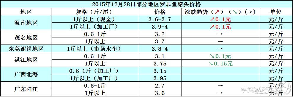 12月下旬,羅非魚購銷情況并沒有太大的增長變動,整體銷售走量還是很少,加工廠方面也沒有新增訂單下達,魚價低迷導致養殖戶信心不足,多數養殖戶都抱著待價而沽的心態,等待明年魚價上漲再賣魚。具體價格趨勢如下: