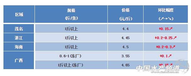 廣東地區(qū):茂名統(tǒng)賣3.9-4元/斤,湛江統(tǒng)賣4.1元/斤,海南統(tǒng)賣4.1-4.15元/斤。年前穩(wěn)中有升,年后小幅上漲。羅非魚大魚存塘量不多,寒潮來襲損耗大,出口加工廠部分啟動,春節(jié)將近訂單多。