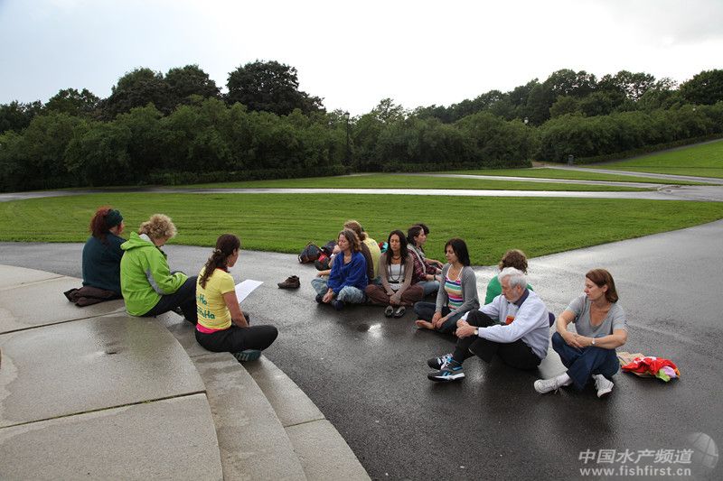 公園里的一群人,好似在冥想,我們猜測是在練瑜伽。剛下過雨,地上都有水,他們都席地而坐。