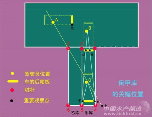 左手握方向盤12點位置,輕抬離合器到半連動,緩慢起步倒車(注意:速度越慢越好,打方向越快越好)向后觀察先把車調正(開始停車位置不正時,需要調正),看3、4號桿對準成直線前30cm(這里提前30cm,是因為與倒乙庫時駕駛員的位置不同)時,也就是圖中3號桿與h點重合的位置,方向盤向左打死方向,這是向左打死方向的最晚的位置,迅速用左手向左打死方向(最好記住圈數,這樣回方向時按同樣的圈數回,車輪容易回正),只可提前不能延后,晚了就沒有調整的機會了。按圖中位置提前30cm比較保險。下面的操作同倒乙庫。