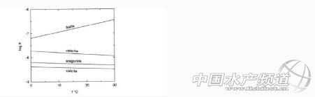 圖3.3:表示溫度與日ikaite、球霰石、文石和方解石log K的關系。在0°C ikaite比其他相更易溶。這是溶解度隨溫度增加而增加唯一的相(引自Bischoff et al., 1993)。