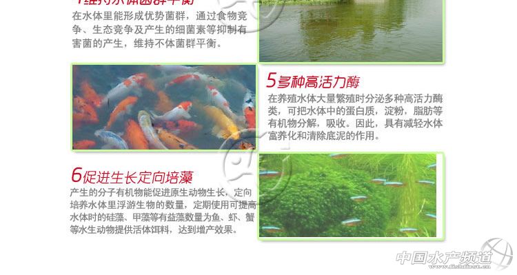 做水產的經常會遇到這樣的問題:由于養殖密度大,導致水質腐敗,水的溶氧量過低,導致魚蝦極易生病,甚至導致死亡。我們這一款微生物益生菌就是針對這一問題而研發的。這一款水產菌種里面包含大量的可以進行光合作用的光合細菌來增加溶氧量,還有發酵系的絲狀菌群和芽孢桿菌等一系列有益菌可以分解水中腐敗物質達到凈化水質的作用。一瓶雖然只有15克但是其中中包含著3000億以上的微生物有益菌,很小的投入就可以做完一個大魚塘。有興趣可以聯系我,非常適合魚蝦養殖場。