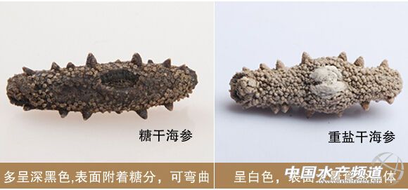 首先看外表,淡干海參外表顏色呈棕褐色,偶爾也有黑色的,看起來很自然(海參的顏色和它生活的環境是直接相關的,如果生活在黑色的海底環境下,在其生長的過程中會慢慢變成黑色);鹽干海參因為含鹽量多,會在海參表面形成細小的鹽結晶,外表顏色呈白色;糖干海參因為添加了糖分,表面是黑亮色的,很飽滿,有光澤。
