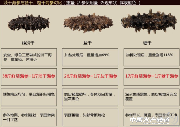 往海參里加糖、加食用膠、加礬,礬的作用就是讓海參加工出來以后“杠杠硬”,使勁掰都掰不動,你還以為是風干的效果好呢。海參行業是一個美味的蛋糕,在利益的驅使下很容易使用一些不良手段,國家已經對海參這類的食品加強了監管,杜絕摻假造假的手段,但面對琳瑯滿目的市場,海參價格的高度不同,我們實在難以分辨。購買海參事如何選購質量上等的淡干海參呢?
