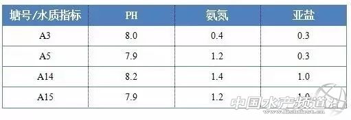 公司采用土塘養殖生魚,養殖面積為36畝,分別是12個小塘,水深為2m,2臺增氧機,底質為泥沙底或於底,二年清一次於。養殖密度為1.6萬每畝,放苗時一斤757條,長兩個月到平均二兩時,爆發爛身病。養殖到二兩之前沒有經常換水,由于投料量逐漸的增加,因此池塘的亞硝酸含量高,池塘的有機物變多,水質環境都比較差,下面是12個塘發病時,任選四個的三個水質指標:pH,氨氮,亞鹽,發病的時間為2016年7月7日。